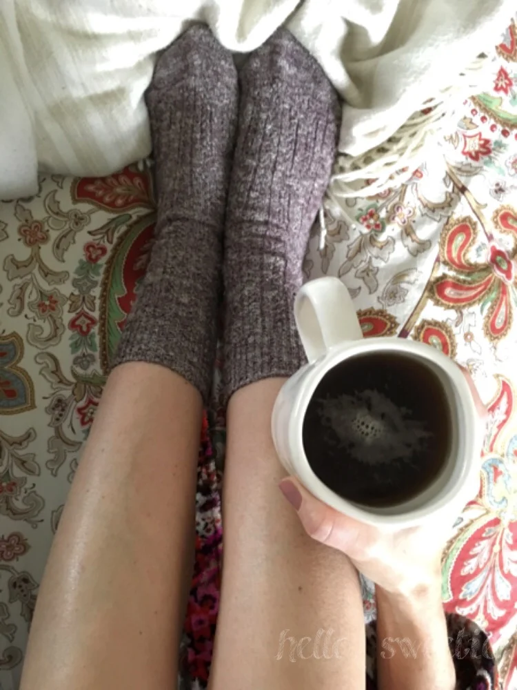 Embracing some hygge essentials: warm beverage, cozy socks & blankets, candles and baked goods!
